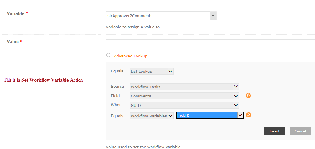 2. Create a string workflow variable and get the value of Comments field in Workflow Tasks list when its GUID =the captured Task ID