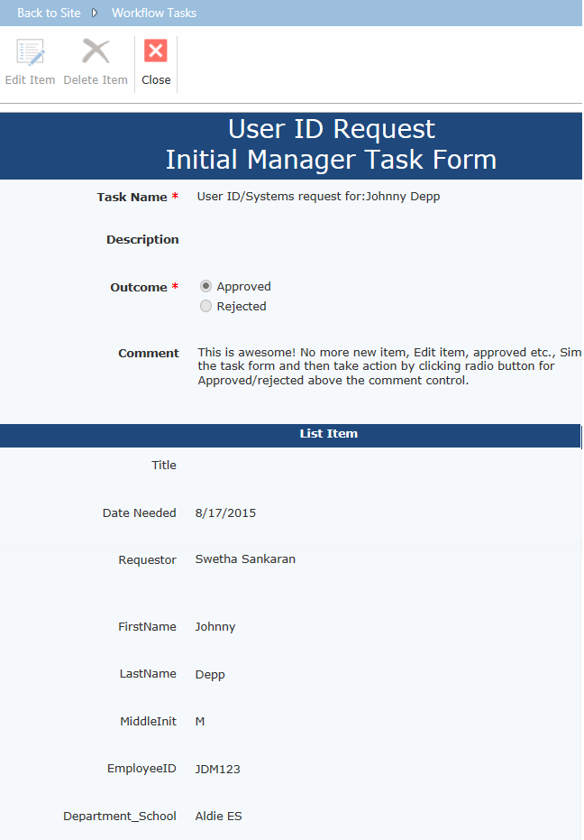 What is cool is also that the item this task is associated is available for approver to see right there in the customized task form view. No more clicking to go to SharePoint list to see what the user details are either.